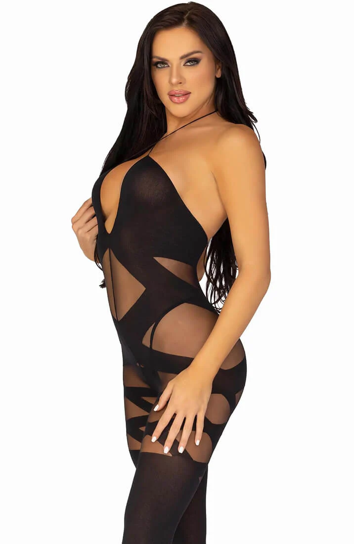 Serve serious body in this curve-hugging crotchless bodystocking, designed with a mix of sheer mesh and opaque panels to tease all the right spots. It is the kind of piece that clings, contours, and does not wait for an invitation.
