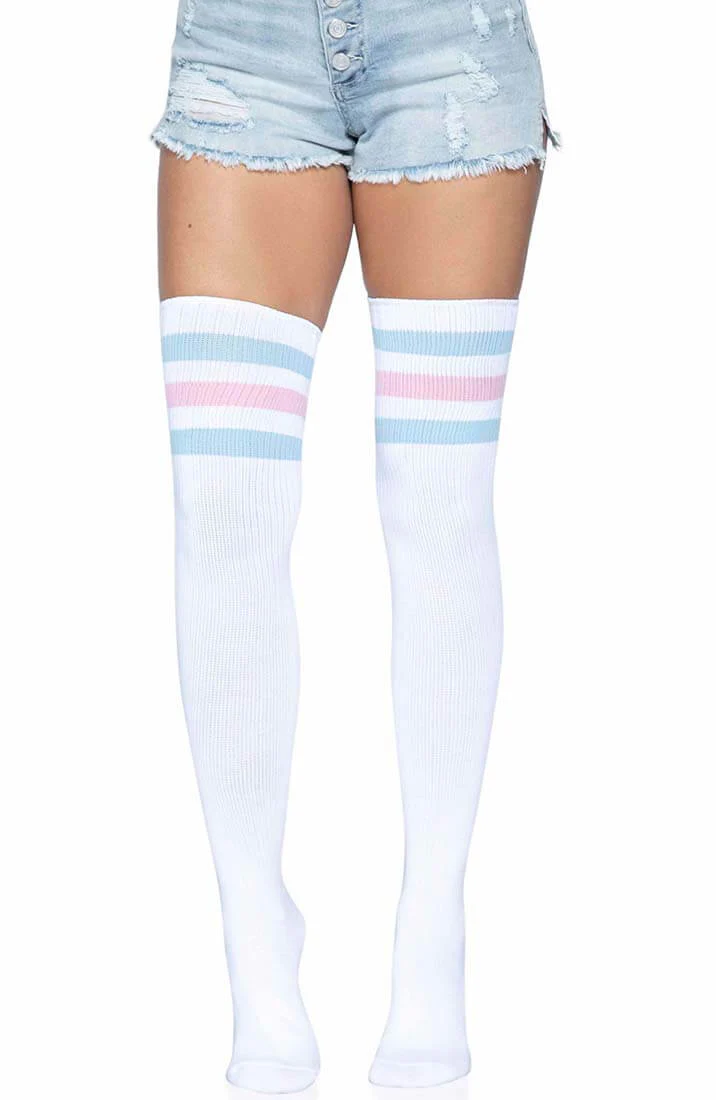 Sporty meets soft girl in these ultra-cute white ribbed thigh highs, finished with pastel blue and pink stripes for the ultimate flirt-friendly finish. Think gym class fantasy - but make it sexy.